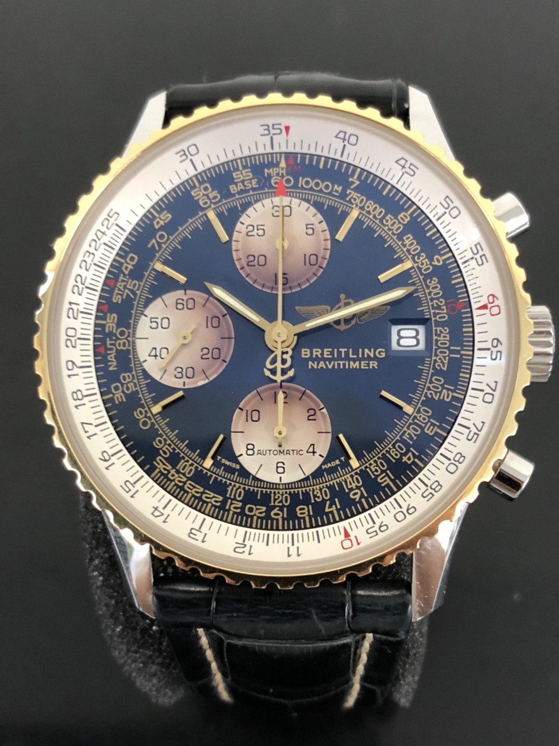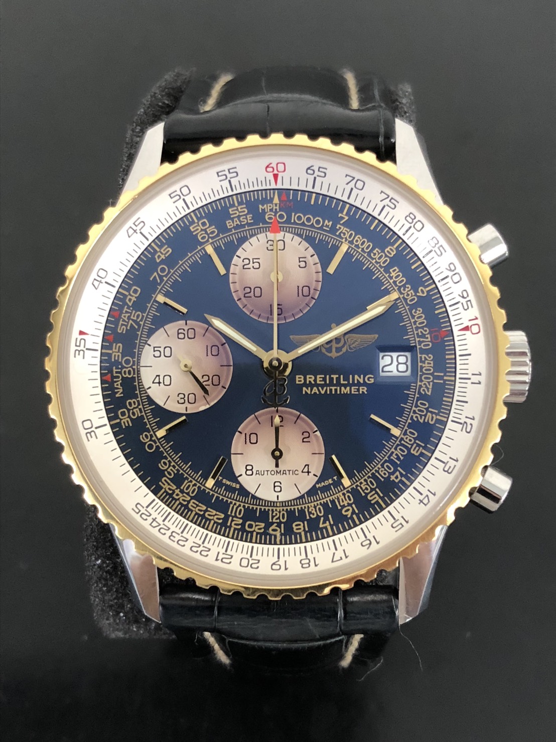 ナビタイマーはブライトリングのブランドアイコンとなるモデルです。1952年に世界初の航空用計算尺機能を搭載したクロノグラフとして誕生しました。管制塔やレーダーがなかった時代、パイロットはこのクロノグラフで速度や燃費を計算し空を飛んでいました。初代モデルは世界パイロット協会AOPAの公式時計に採用されています。初代からデザインは継承しながらパフォーマンスを進化させ、今もなお支持される究極のパイロットウォッチです。
