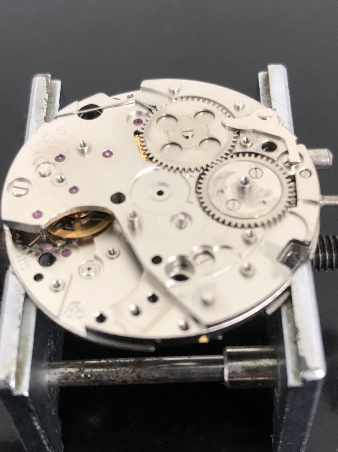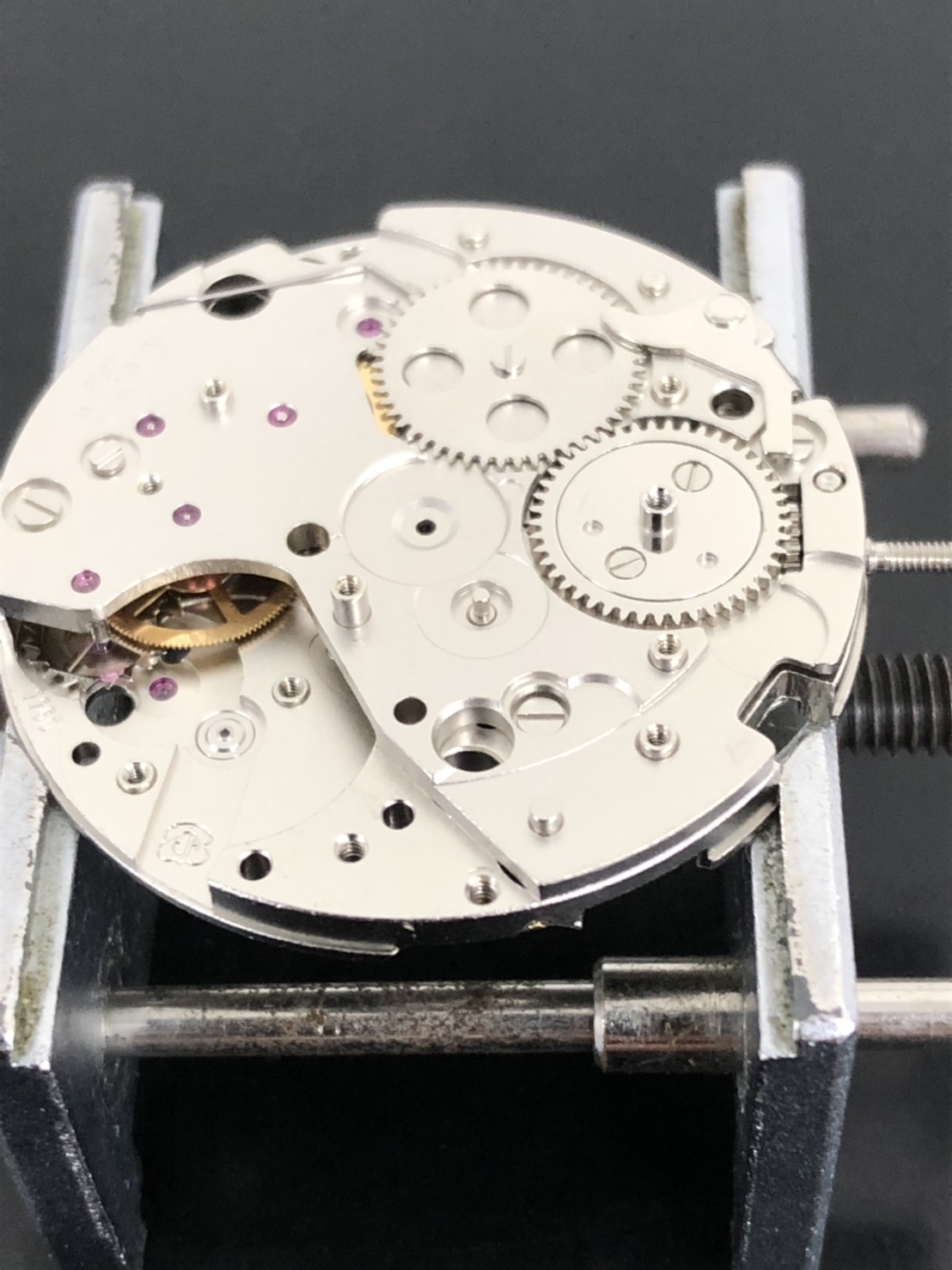 部品・バンドの洗浄が終わったら、組み立てながらその箇所に応じた油を注入していきます。油が多過ぎても少な過ぎても時計に不具合が出るため、職人技を要する作業となります。 機械が組み上がったら、歩度測定器(1日・1カ月に何秒の狂いが出るか測定する機械)でコンディションを調整していきます。さまざまな姿勢を想定して、角度を変えて歩度を測り、調整します。 これも、経験を要するかなり難しい作業です。