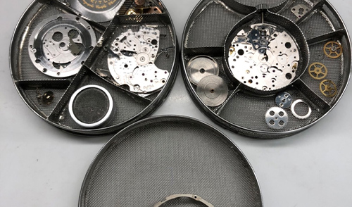 専用工具を使用して、まず時計のバンドを外し、次に裏蓋を開けます。傷を付けないよう慎重に行ないます。 とても繊細な針、文字盤や日付の板、部品同士くっついているパーツなども全て外していきます。 全てをバラバラにするとかなりの部品数になります。息で飛んで行ってしまうほど小さなミリ単位の部品もあり、シェル(貝)や特殊な素材でできた文字盤など、かなり繊細な部品が多いため、保管には細心の注意を払っています。