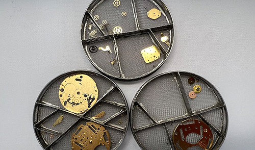 専用工具を使用して、まず時計のバンドを外し、次に裏蓋を開けます。傷を付けないよう慎重に行ないます。 とても繊細な針、文字盤や日付の板、部品同士くっついているパーツなども全て外していきます。 全てをバラバラにするとかなりの部品数になります。息で飛んで行ってしまうほど小さなミリ単位の部品もあり、シェル(貝)や特殊な素材でできた文字盤など、かなり繊細な部品が多いため、保管には細心の注意を払っています。