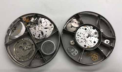 部品の分解が全て済んだら、いよいよ洗浄です。高額なブランド時計にも対応できる専用の自動洗浄機にパーツを入れて、汚れた油を一度きれいに洗い流します。人間の髪の毛を洗うのと同じで、専用のシャンプーとリンス液を使用します。 バンドは豚毛のブラシを使用して隙間の汚れを落とし、超音波洗浄機で手では落とせない細かい汚れも落とします。 その後、専用のヒーターで水分を残さないようにしっかり乾かします。