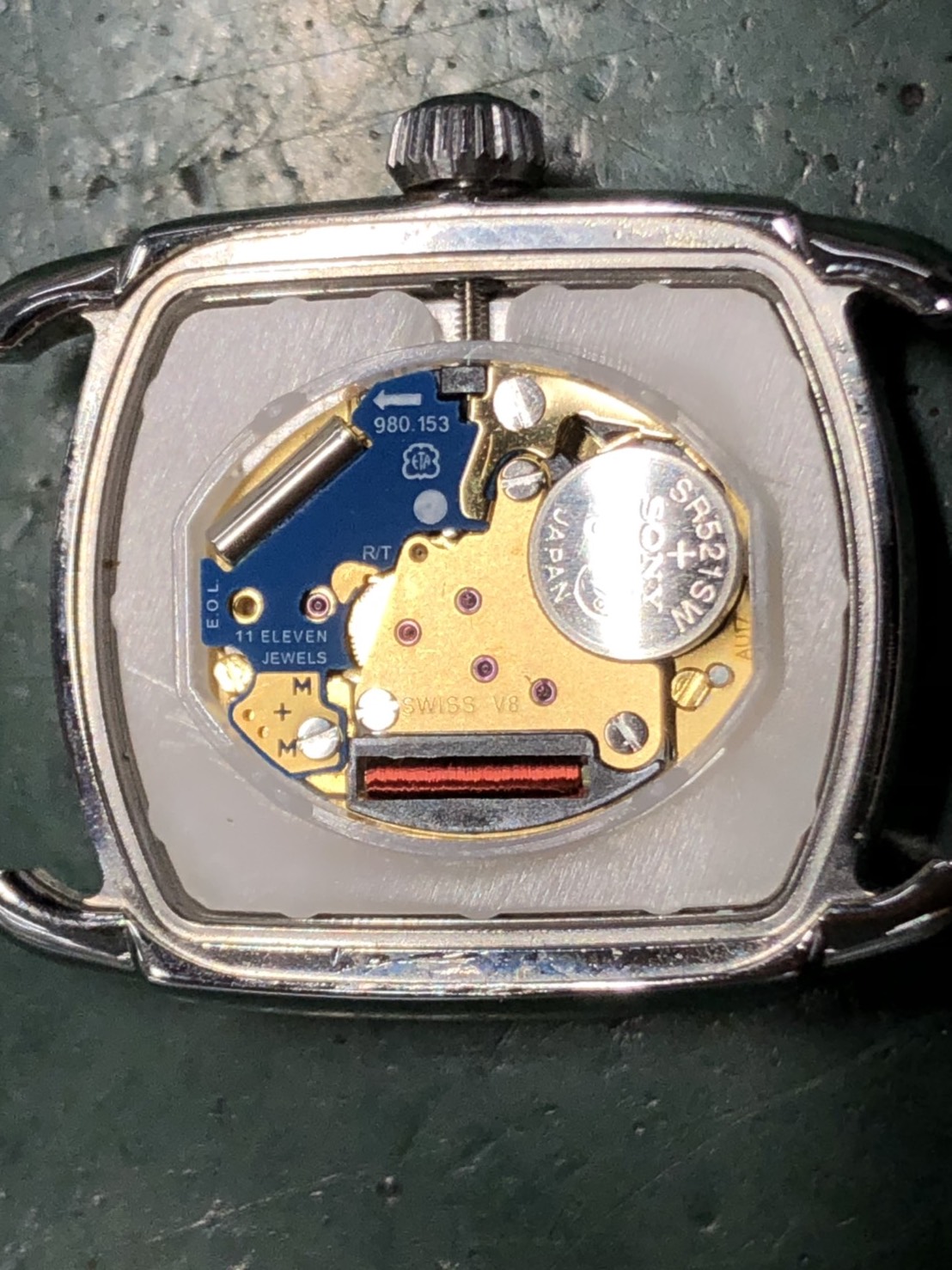電池交換を行われても時計が動かない原因を知るために、内部の調査を行いましたところ、時計に強い磁気帯びが生じていたことが主な原因となっているようでした。脱磁処理とオーバーホールを行い、正常稼働するようにいたしました。 磁気帯びは、テレビやスマートフォンなど、磁気を発している電化製品等に時計を近づけると生じることがあります。故障の原因となり得ますので、磁気帯びに対しては、脱磁という永久磁石となったものから、逆に磁力を取り除く作業が必要です。一つ一つ、細かな部品の磁気を抜いていきます。