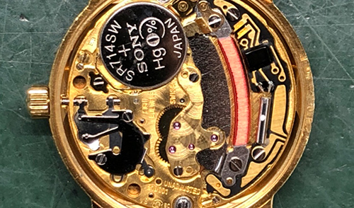メンテナンスをご希望されておりましたので、内部の確認を全体的に行いました結果、電池から液漏れが生じていたため、回路等の交換を行いました。電池の液漏れは、多くの場合、時計が止まった後、長期間放置することで生じます。早期発見のためにもメンテナンスやオーバーホールは重要です。