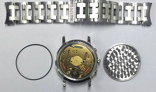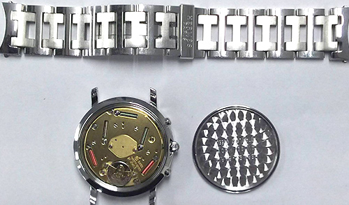 電池交換をしても時計が遅れているということで、内部に不具合が生じているようでした。調査しましたところ、油切れにより部品がスムーズに噛み合わずにいたことが原因であるようでした。油の差し直しやパッキン交換などのオーバーホールを行い、時計が正常に動くようになりました。