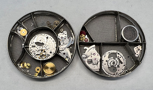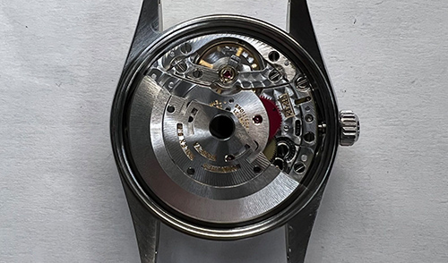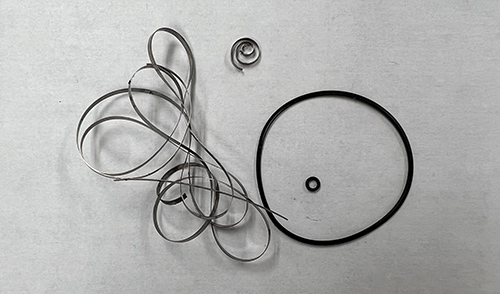 動かなくなった原因は、ゼンマイ切れによるものでした。 ゼンマイは時計の動力部です。ここを巻き上げ解けるという動作で、 時計は時間を刻み続けることが出来ます。 常に手巻きや自動巻きによってゼンマイは巻き上がり、解けていきます。 そのため、内部で発生する金属同士の磨耗などで汚れやすく、劣化していくため交換が必要な部品です。