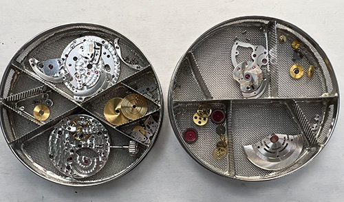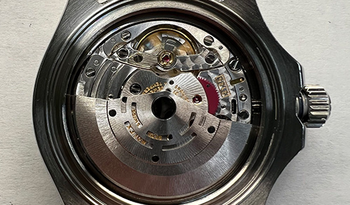 機械の汚れ・油切れがございましたが、日々使用していくなかで、ゼンマイが巻きあがり、歯車が針を動かすという当たり前の動きの中で、どうしても潤滑油も劣化し、汚れてしまいます。その部品を1つずつ分解し洗浄しながらそれぞれの部品の調整を行いつつ、専用油を注し、組み立てを行いました。 ローター真という自動巻独自の部品が摩耗していましたので交換しました。 ローター真とは、中心にはベアリングがはめ込まれており、非常に軽快な回転運動を起こせるようになっております。しかし、その取付は特殊ネジ1本で取り付けているだけであり、時間が経過することでローターの回転自体は中心から外れて回り出すようになります。回転する動作の中で、中心から外れてまいりますと、ローターを止めているローター真に力が加わり、ローター真が損傷してしまいます。