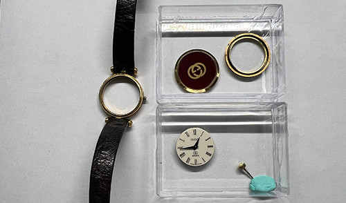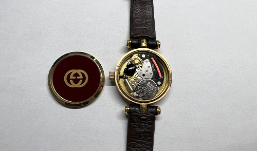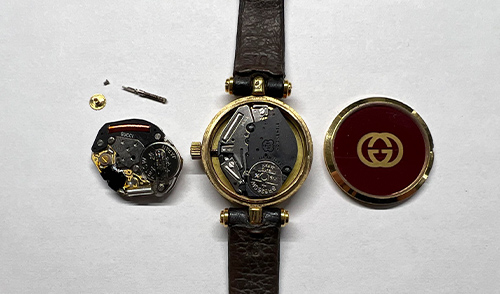 お時計は、内部機械全体に劣化・摩耗があり、特にムーブメント交換が必須の状態でございました。 交換用ムーブメントは捜索をさせていただきましたが、メーカー直営店同様に在庫がなかった為、代替ムーブメントに交換させていただきました。 代替ムーブメント交換に伴い、現在の針を取付可能に加工を実施しました。