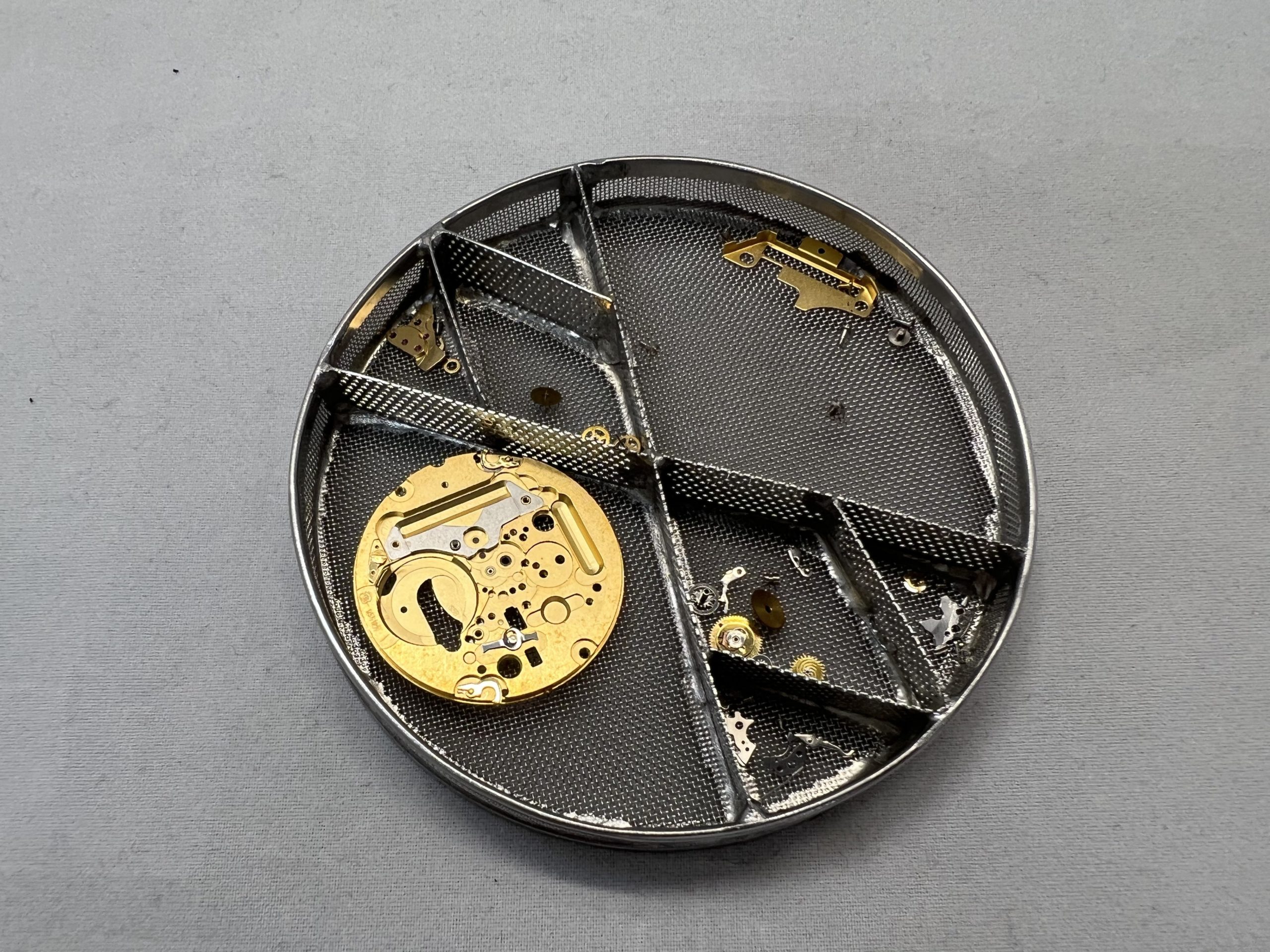 リューズに関しましては、欠けや腐食など劣化が見受けられました。 今後更に破損し、機能性を失ってしまう可能性もありますので新しいリューズへ交換しました。 不動の状態の原因としましては、機械の汚れや油切れが考えられます。 部品を1つずつ分解して洗浄しながらそれぞれの部品の調整を行いつつ、専用油を注油し、組み立てました。 また、ツヅミ車に歯欠けが見受けられましたので、新しいパーツへ交換いたしました。 ツヅミ車とは、リューズを回し時間合わせを行う際に、それぞれの部品へ回した力を伝える役割のある歯車となります。
