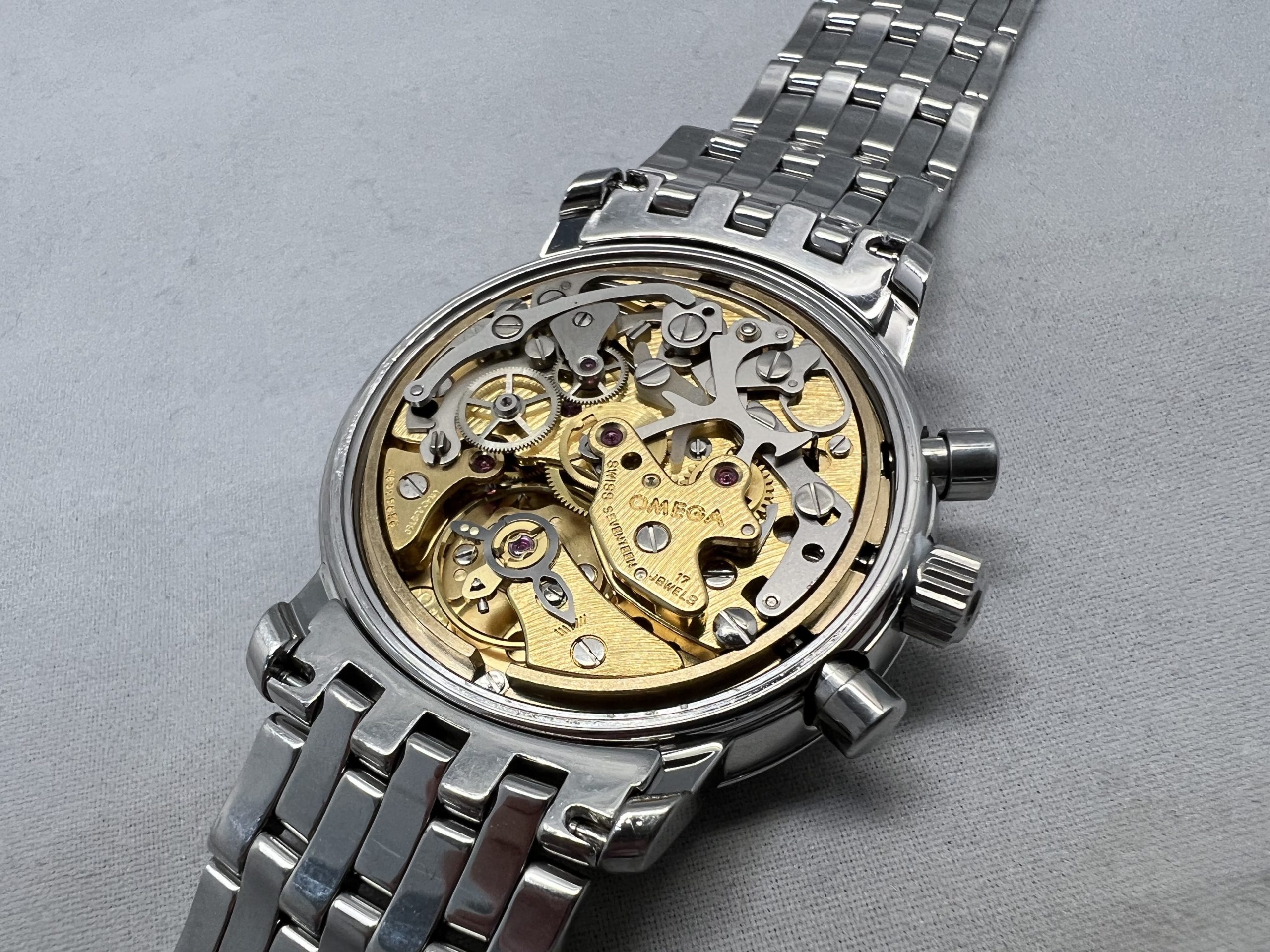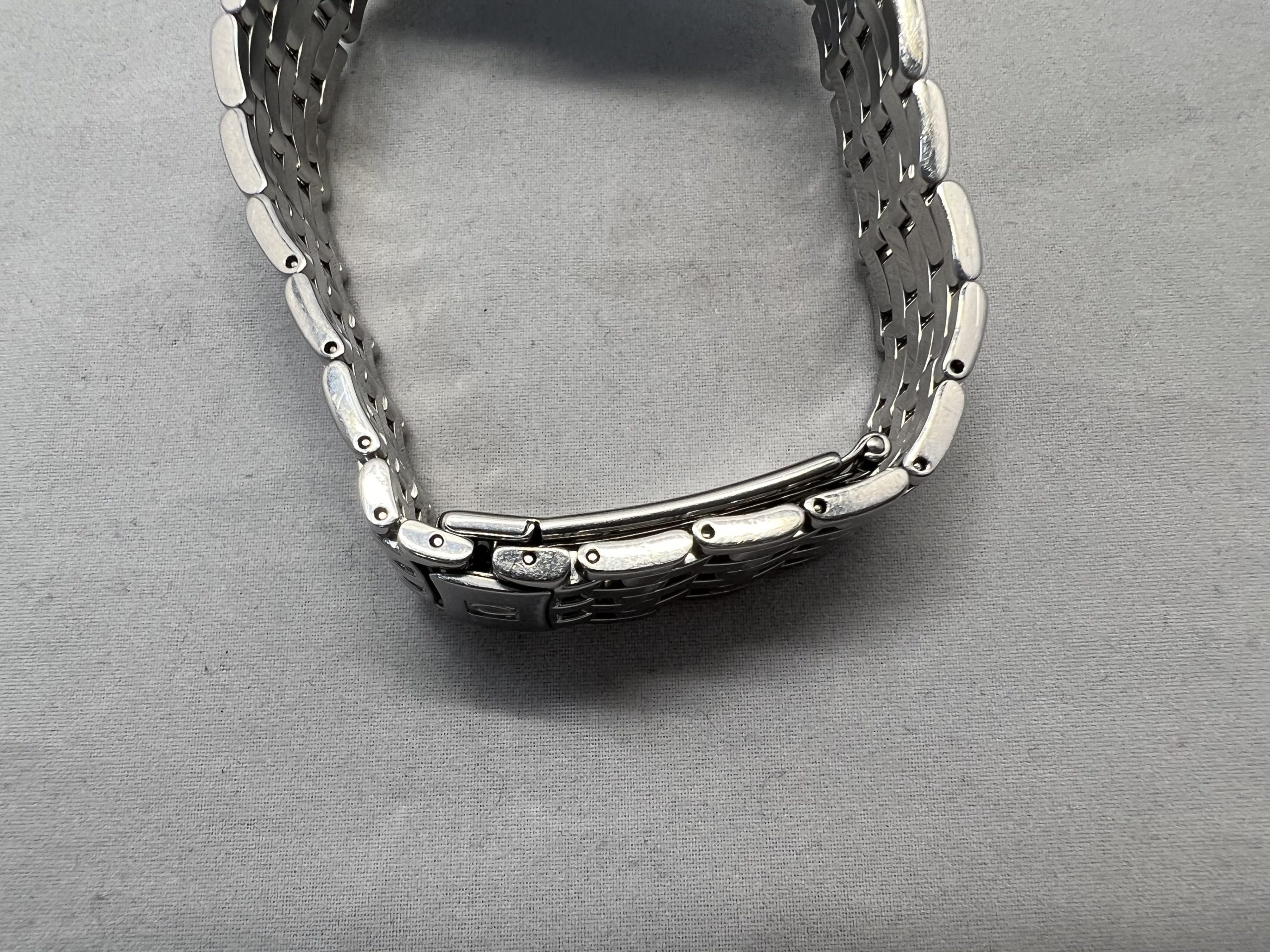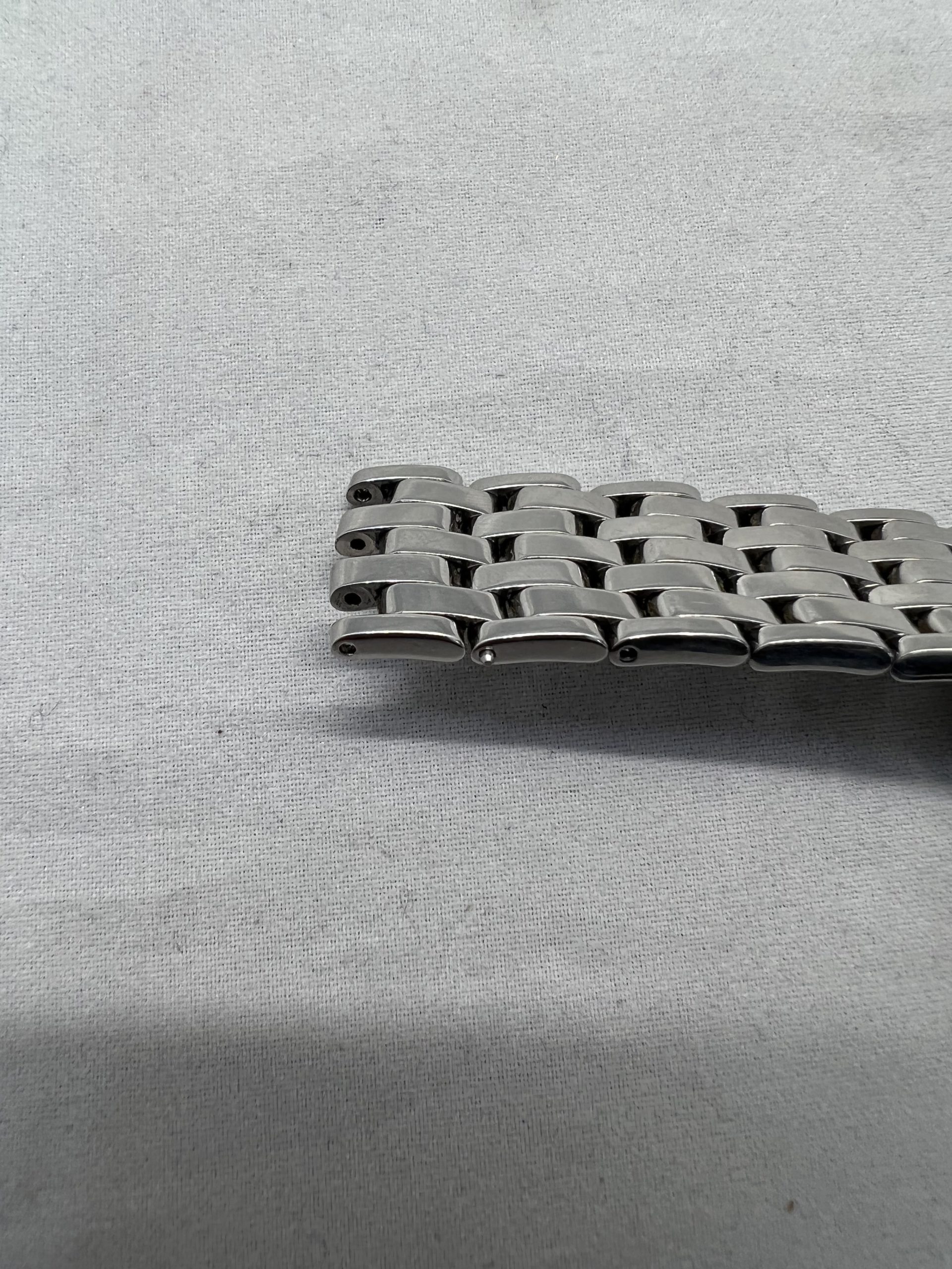 ゼンマイとは時計の動力部です。内部で発生する金属同士の磨耗などで汚れやすく、 今回、切れてしまっている状態の為、新しい部品に交換致しました。 ご依頼にはございませんが、お預かり時よりバンドの6時側の駒に緩みが見受けられる状態でした。 お時計落下の恐れもありますので、併せてバンドのピン・パイプ交換を行いました。