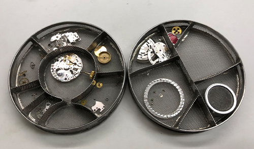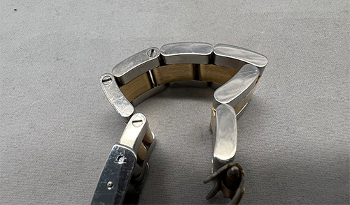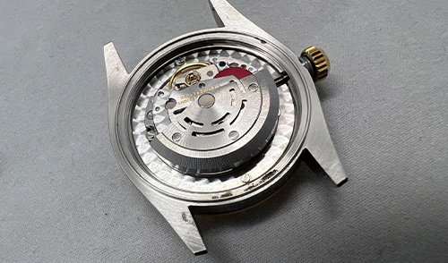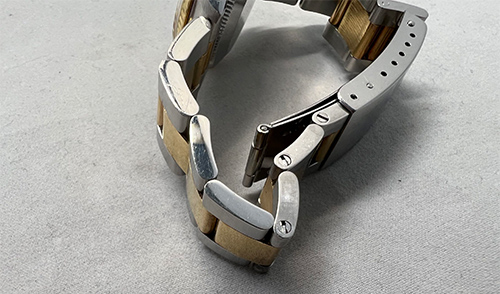 ムーブメントに油汚れがあり、油切れをしていました。 部品を1つずつ分解し洗浄しながらそれぞれの部品の調整を行いつつ、専用油を注し、組み立てました。 お預かり時より、バンドの6時側に固着して箇所が見受けられました。 また、原因は分かりかねてしまいますが、駒と駒の隙間が無くなっているような状態でしたので、ピンの調整を行い、可動する様に修正いたしました。