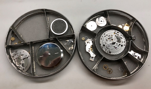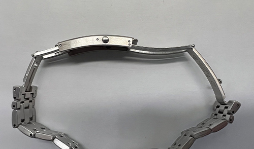 機械の汚れ・油切れがありました。部品を1つずつ分解し洗浄しながらそれぞれの部品の調整を行いつつ、専用油を注し、組み立ててました。 ゼンマイからの動力をテンプ、アンクル、ガンギ車などの部品へと伝達し、歯車へ送っていきます。 最終的に行き着く所が輪列と呼ばれる2番車、3番車、4番車部品で時分秒針につながる部分でございます。 今回、いずれもパーツに摩耗が見受けられましたので、新しい部品へ交換しました。 中留(バンドを留めるパーツ)の中板部分に歪みが見受けられる状態でした。お時計落下の恐れがございますので、中留の交換を実施しました。