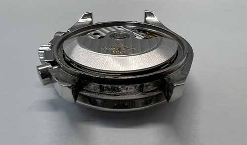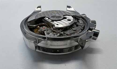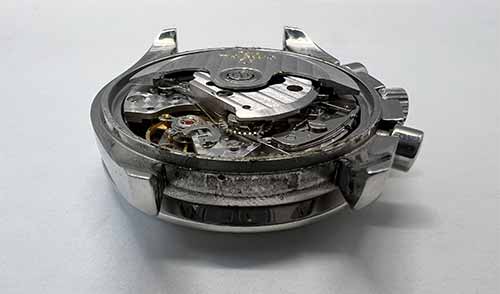 動かなくなってしまった原因は、内部の油切れによるものと考えられます。 また、クロノグラフカナのホゾが折れていたのでクロノグラフの動作を正常化するために軸の交換をしました。
